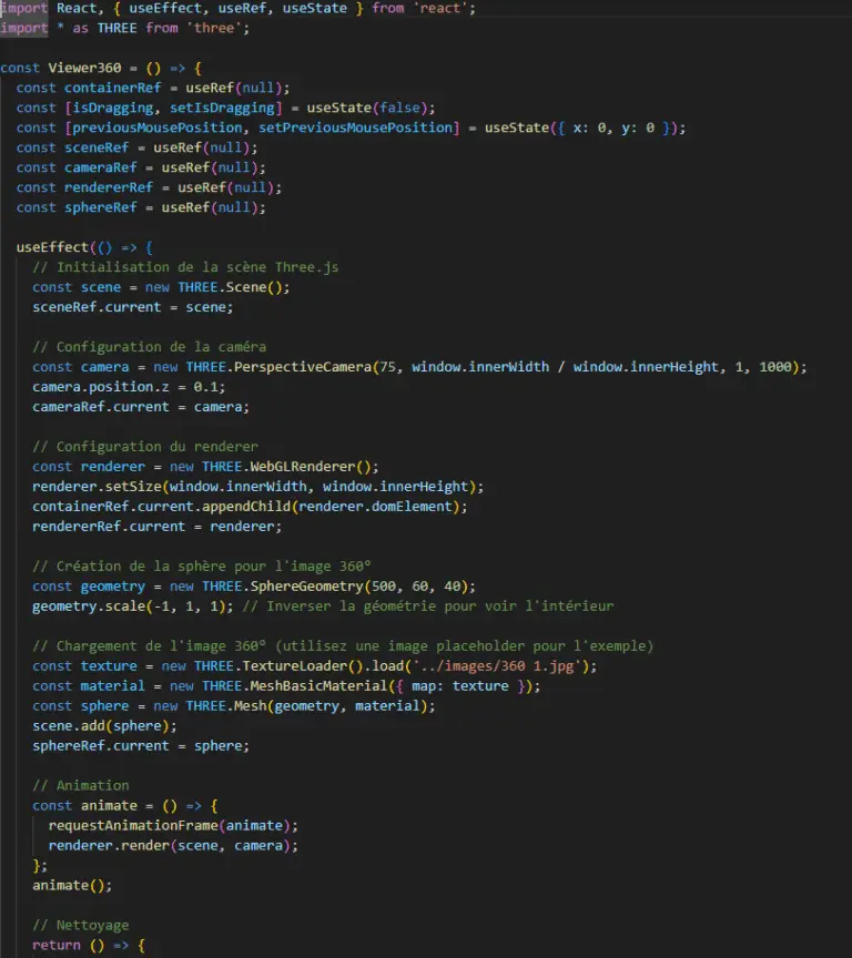 Pour rendre la visite 360° réellement interactive, j’ai intégré différentes fonctionnalités en JavaScript. Ce langage m’a permis d’ajouter du dynamisme au site, notamment en rendant la navigation plus immersive autour de la scène à 360°.